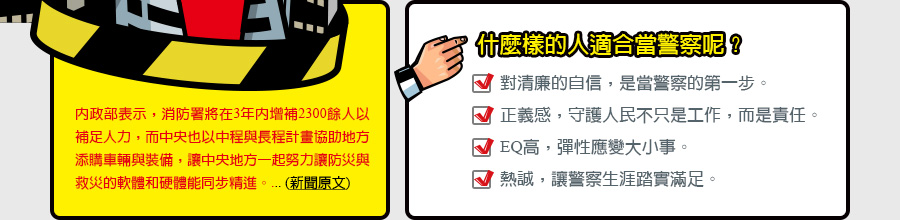 「受到這件事的影響,我深深體會到助人的快樂。想到醫院擔任志工服務人群,同事就建議我可以考慮轉往公職,報考以救護為主的工作,像是消防警察。因為她的先生本身就在消防隊裡服務,所以經常跟我分享工作上的趣事,間接使我對消防警察的生活產生憧憬。」