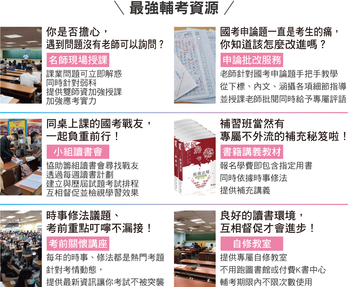 社會人士 大學在校生 課程推薦-公職考取班 專屬特色 學費最省 第二年起,每年學費0元(只需繳交教材換證費即可上新年度課程) 保障完整 一次報名,輔導至考取為止 加修優惠 加選題庫班、奪榜班、單科課程保證最優惠! 考取最賺 第一年考取三等考試即頒發高額獎學金 現在報名 享專屬優惠價 課程特色 專為大學生量身訂做,可以兼顧學業與考試,一次繳費輔導至大四,期間不須再繳學費(延畢除外)寒暑假可以轉至全國各班觀看課程。 大一到大四 分別給你對應的課 大二專班 大三專班 年度班 大一 在校生活 在校生活 在校生活 大二 任選兩科 大三 普考科目全修 普考科目全修 大四 高考科目全修 高考科目全修 高考科目全修 現在報名 享專屬優惠價