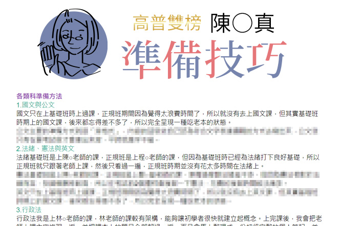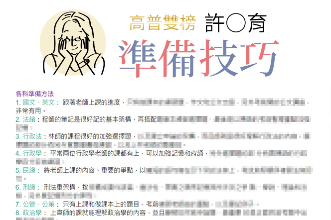 我選擇函授的方式學習,讓我在需要兼顧大學課業之際也能彈性地學習高普考的課程。高普考科是我從未接觸的領域,老師授課方式及很棒的教材讓我學習漸入佳境劉O華